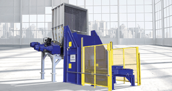 The Material is pushed into the shredding chamber by a powerful Hydraulic Pusher powered by a sturdy piston, controlled by an electronic device, which allows a correct and constant material pushing and a continuous generous flow of Shredded material.